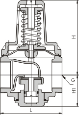 出口壓力下降,彈簧推開(kāi)隔膜和閥瓣開(kāi)啟減壓閥。 下游用水(關(guān)閉)時(shí): 主要外形尺寸